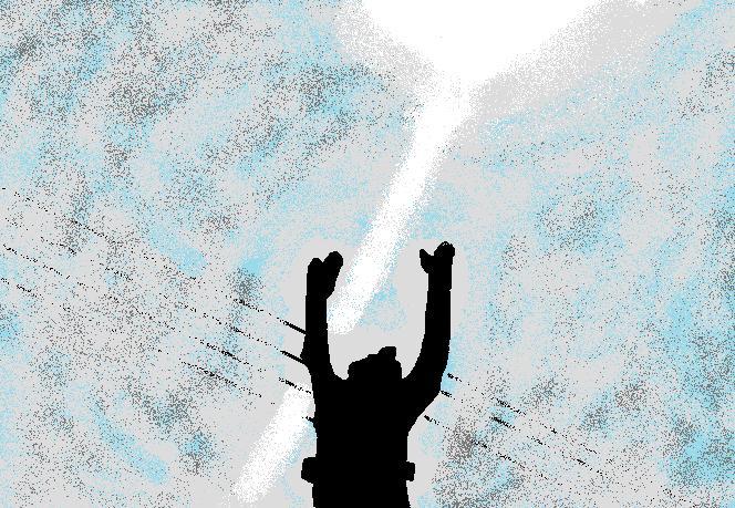 曇天の中に差す日光。それを求めるように一直線に飛び上がる。その場所は電線の下という近所にも存在しそうな風景。そんなライダー変身の際のイメージ。