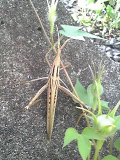 枯れバッタ緑の草地に現れる